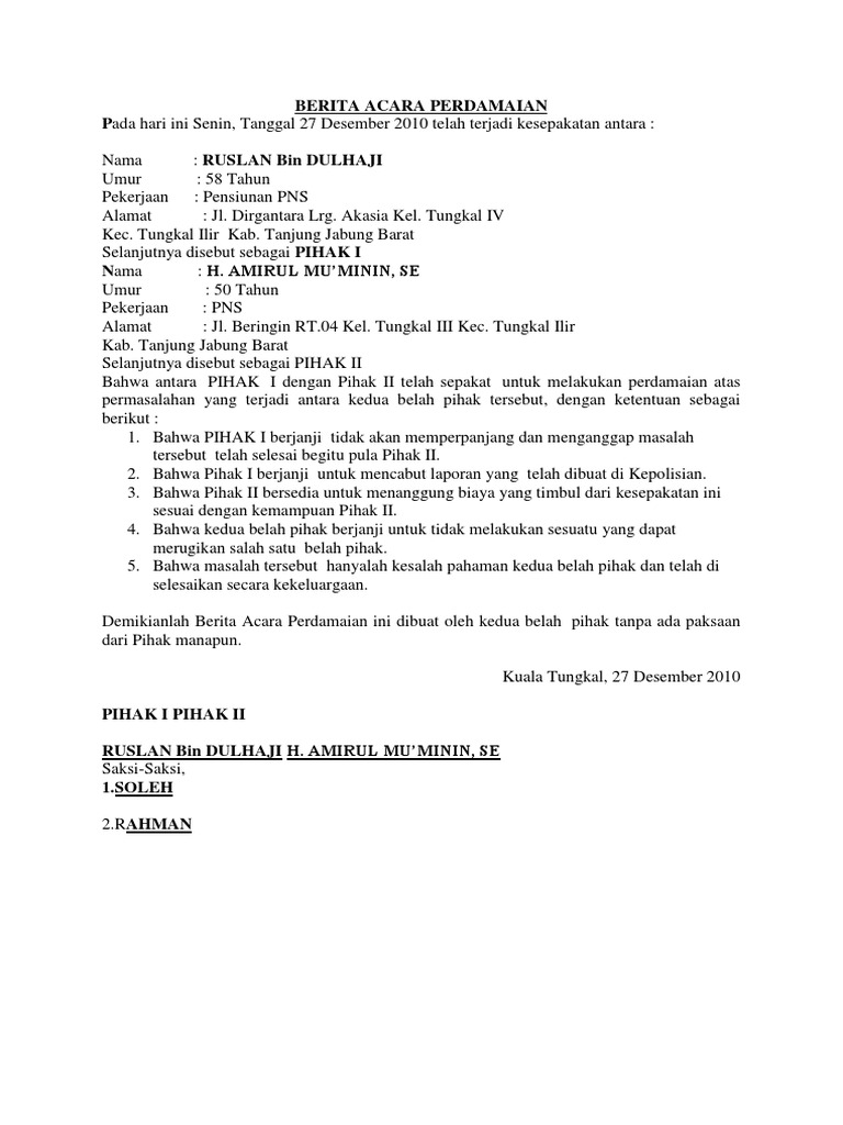 Jika antara pihak yang berselisih sudah memutuskan damai dan masalah perkelahian ingin diselesaikan secara damai ,sebaiknya perlu di buatkan contoh surat perjanjian damai perkelahian agar dapat. Mulai dari contoh surat pernyataan diri sendiri. Contoh surat perjanjian damai perkelahian. Surat ini dapat dipergunakan dalam berbagai keadaan sebagian besar sebagai jaminan. Jadi, surat pernyataan bermaterai memiliki dasar hukum yang kuat sebagai pembuktian.